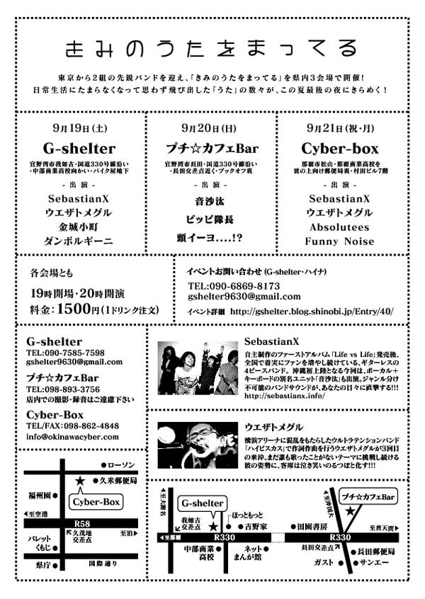 東京から2組の先鋭バンドを迎え、「きみのうたをまってる」を県内3会場で開催!